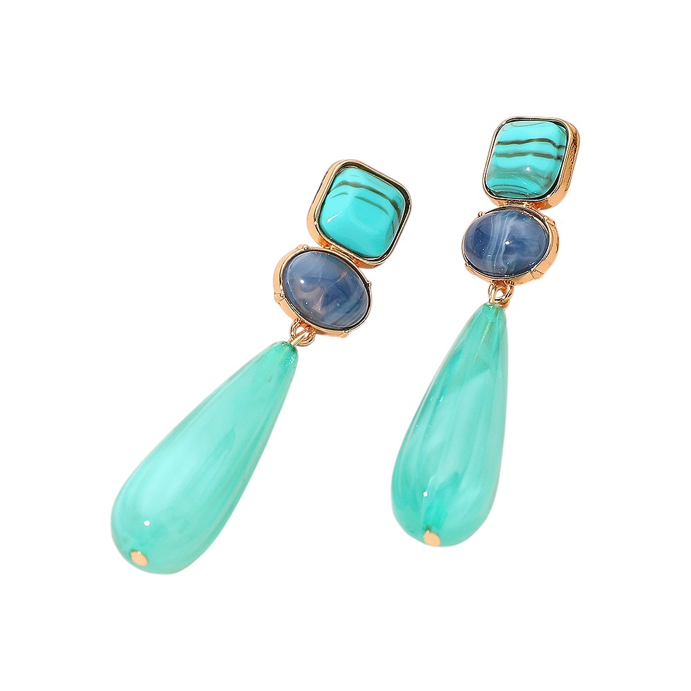 Details • Size : 0.6" X 3" • Post Back • These elegant teardrop dangle earrings feature smooth, marbled drops paired with chic geometric accents. Perfect for adding refined sophistication to both casual and formal looks, they bring a graceful balance of modern style and timeless feminine charm. • Lead and Nickel Compliant