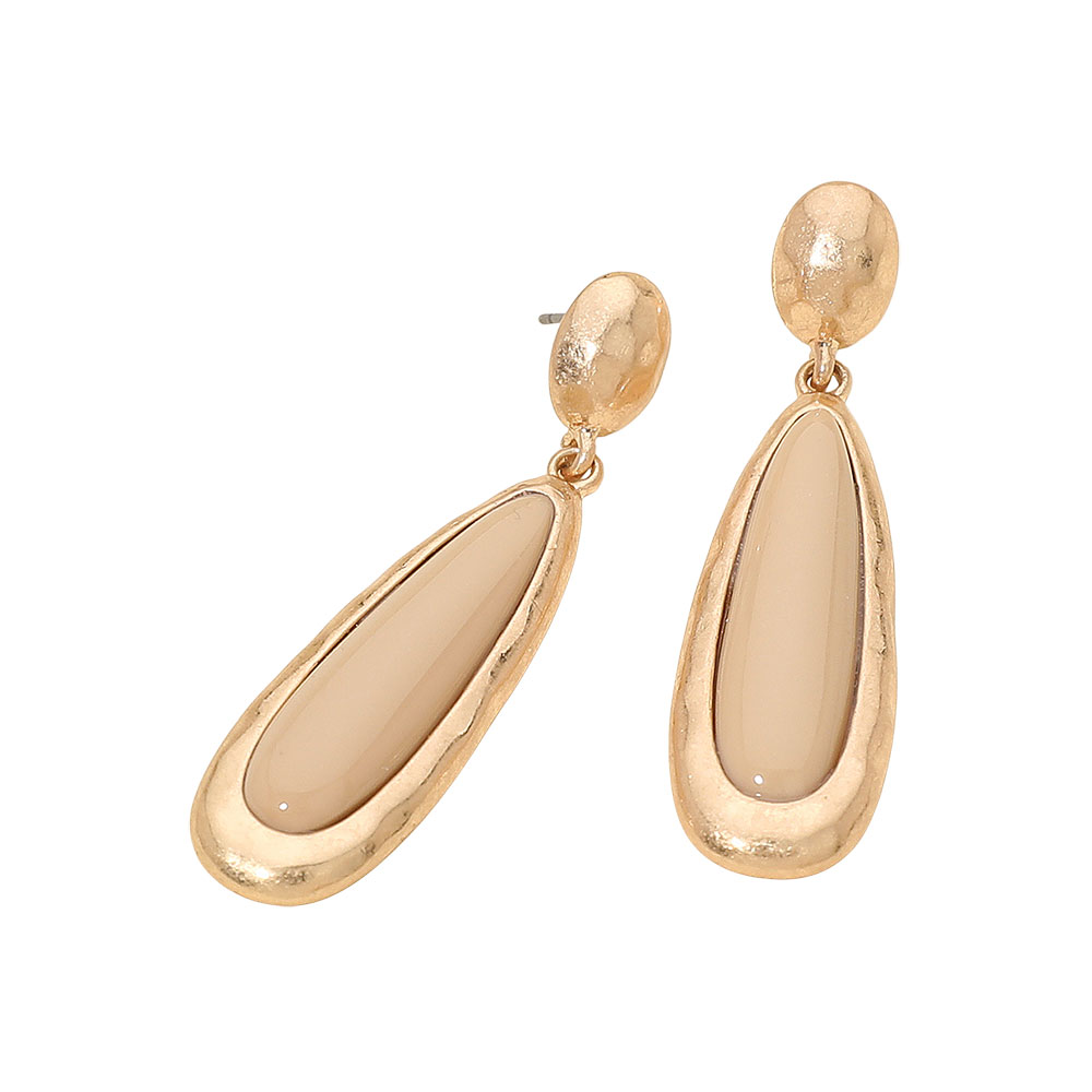 Details • Size : 0.6" X 2.2" • Post Back • These elongated teardrop statement earrings feature a sleek, polished centerpiece framed by a textured metallic design. Lightweight yet bold, they add modern sophistication to both casual and dressy looks, making them a versatile accessory for everyday wear or special events. • Lead and Nickel Compliant
