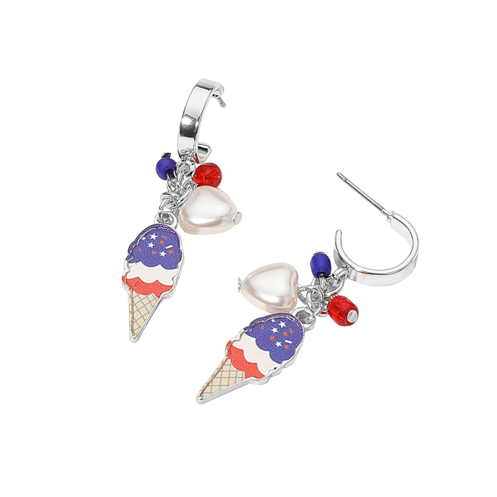 Enamel American USA Flag Ice Cream Cone Pearl Heart Beads Charm Dangle Earrings