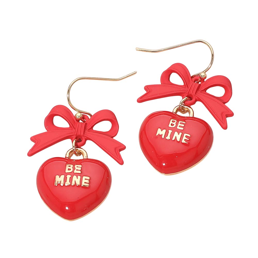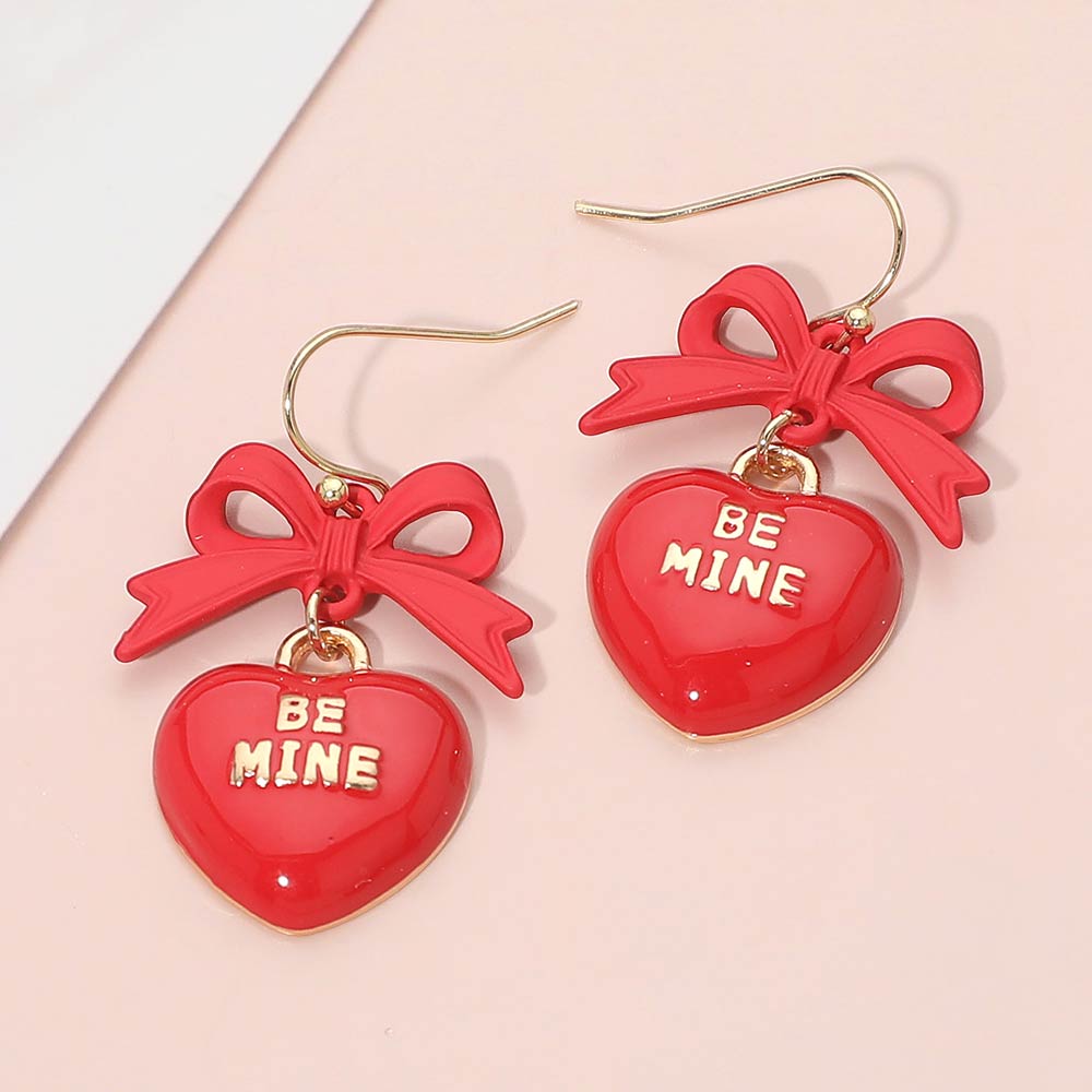 Enamel BE MINE Heart Drop Bow Link Dangle Earrings