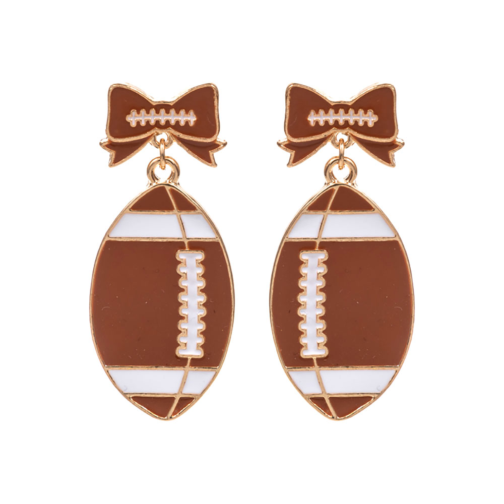 Details • Size : 0.7" X 1.6" • Titanium Post Back • These Bow and Football Drop Earrings feature a playful blend of sporty style and feminine charm. Perfect for football fans and fashion lovers, their fun design adds a trendy touch to any outfit, making them ideal for game days, casual outings, or themed celebrations. • Hypoallergenic • Lead and Nickel Compliant