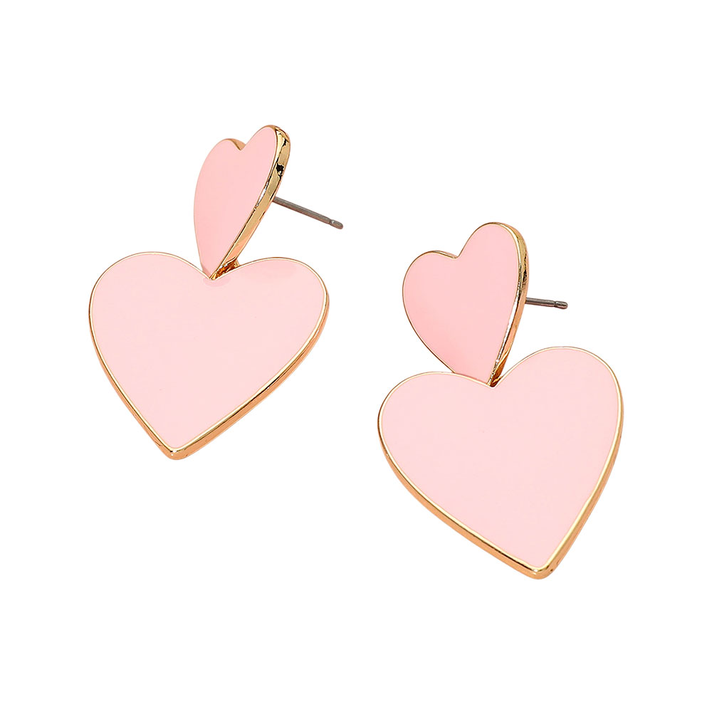 Details • Size : 1" X 1.7" • Post Back • Add a touch of romance to any outfit with these double heart drop earrings. Featuring a charming layered heart design with a polished finish, they bring playful elegance to your everyday or date-night look, making them the perfect statement of love and style. • Lead and Nickel Compliant