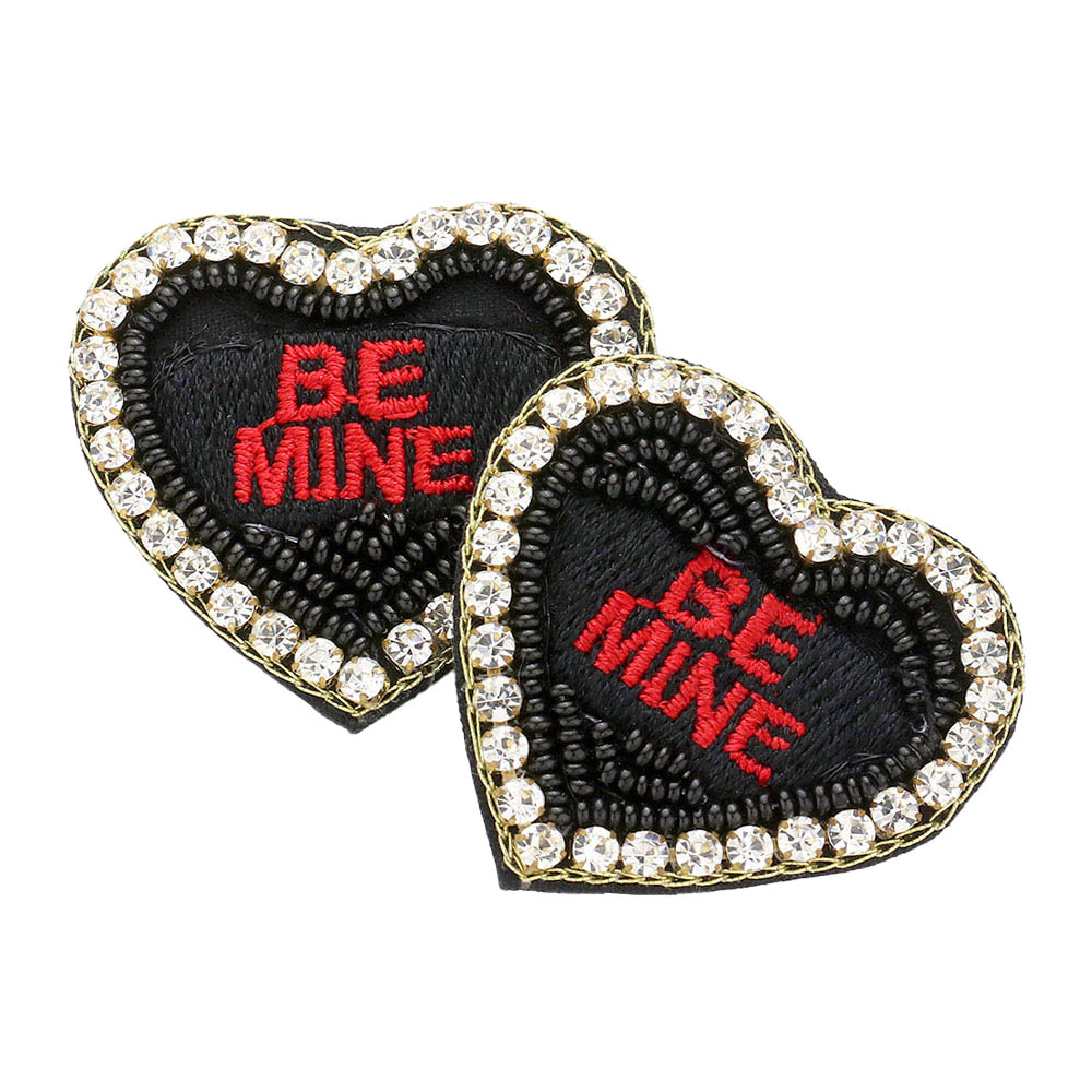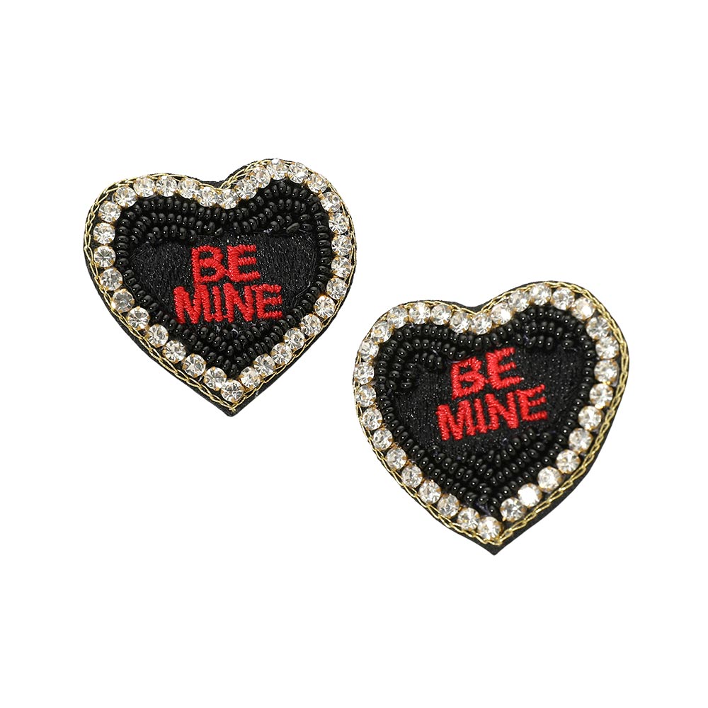 Felt Back BE MINE Message Embroidered Seed Bead Stone Embellished Earrings