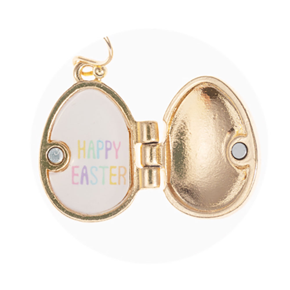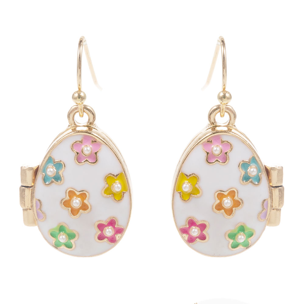Details • Size : 0.7" X 1" • Brass Fish Hook Back • Whimsical locket-style egg drop earrings featuring a charming open design with seasonal detailing. Lightweight with gentle movement, they add playful personality to outfits, ideal for celebrating special occasions or gifting to anyone who loves unique, festive statement jewelry. • Brass • Hypoallergenic • Lead and Nickel Compliant