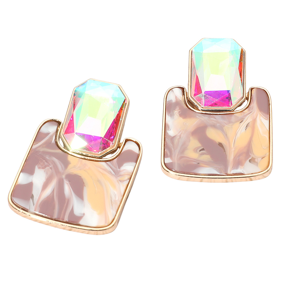 • Stand out with these geometric gemstone stud earrings featuring a striking print accent on resin plate. The bold contrast between faceted stones and patterned detail creates a chic, fashion-forward look—perfect for adding a statement touch to both casual and elegant outfits.