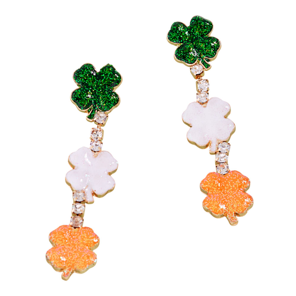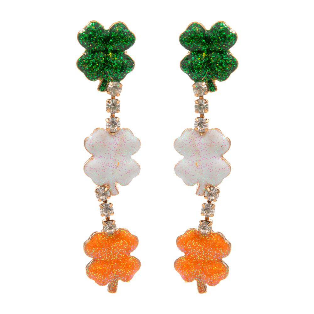 Details • Size : 0.5" X 2.1" • Titanium Post Back • Festive drop earrings featuring a trio of shamrock charms linked with sparkling accents for eye-catching movement. Designed for seasonal celebrations, parades, themed outfits, or gift giving, adding playful style to day or evening looks with a lightweight feel. • Hypoallergenic • Lead and Nickel Compliant