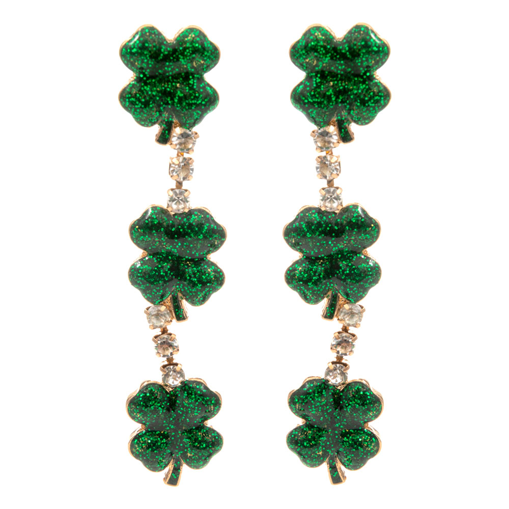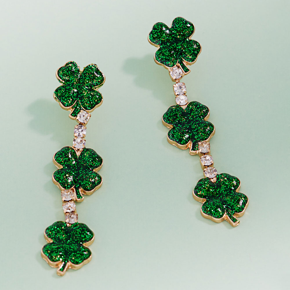 Details • Size : 0.5" X 2.1" • Titanium Post Back • Festive drop earrings featuring a trio of shamrock charms linked with sparkling accents for eye-catching movement. Designed for seasonal celebrations, parades, themed outfits, or gift giving, adding playful style to day or evening looks with a lightweight feel. • Hypoallergenic • Lead and Nickel Compliant