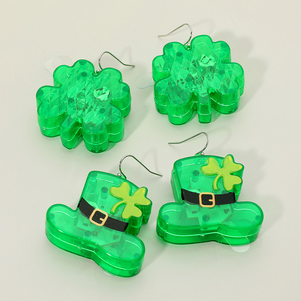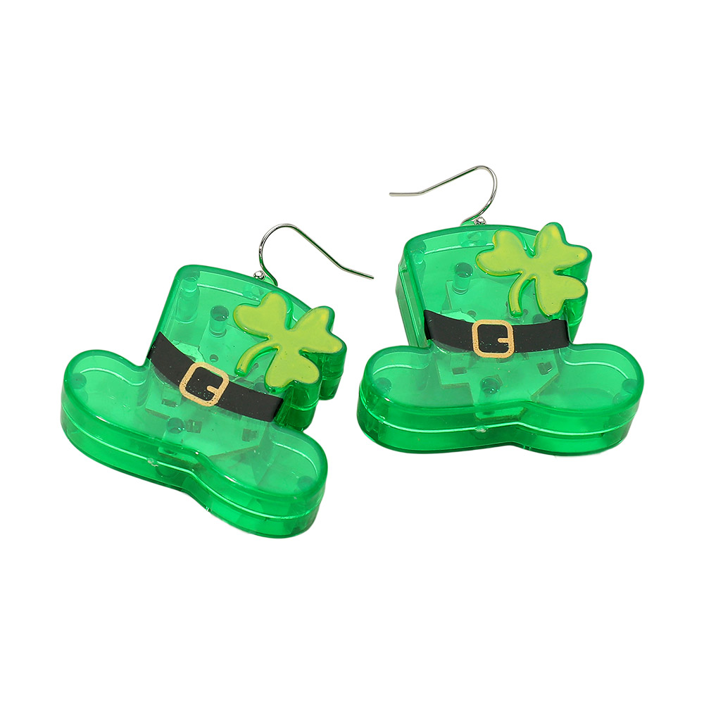 • Festive light up St. Patrick’s Day drop earrings featuring a playful leprechaun hat design with shamrock detail. A bold statement accessory perfect for parades, parties, themed outfits, seasonal gifting, and holiday displays that celebrate lucky charm style with eye-catching dimension and fun appeal.