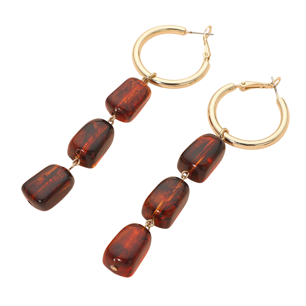 Details • Size : 1.25" X 3.75" • Omega Back • These long drop hoop earrings feature stacked tortoise-style accents that create a bold, modern silhouette. Their sleek, elongated design brings effortless sophistication, making them a standout accessory for elevating both casual and dressy looks with warm, eye-catching detail. • Lead and Nickel Compliant
