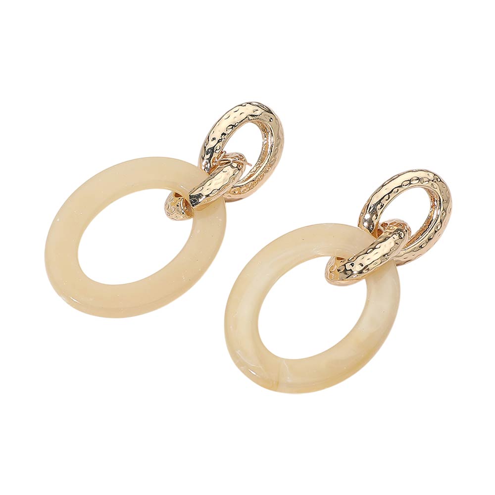 Details • Size : 1.2" X 2.25" • Post Back • Modern linked drop earrings featuring a smooth oval design paired with a textured ring accent for added depth and movement. The layered silhouette creates an elegant balance of structure and flow, making these earrings easy to style from day to night. A versatile statement accessory that elevates everyday outfits, workwear, and special occasion looks with effortless sophistication. • Lead and Nickel Compliant