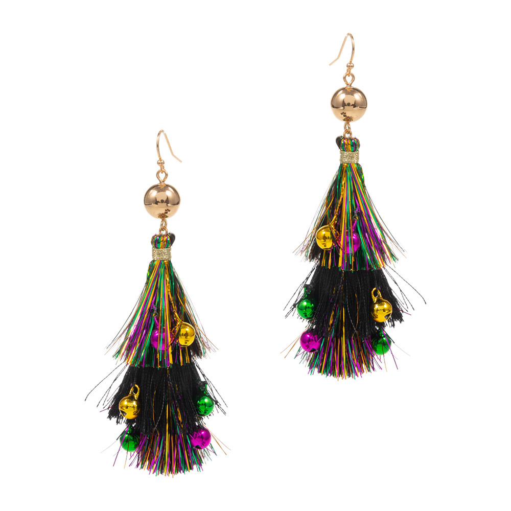 • Add festive flair with these Mardi Gras layered tassel drop earrings. Designed with shimmering multitone threads and playful movement, they bring instant energy to any celebration look. Perfect for parties and parades, these earrings exude bold charm and vibrant carnival spirit.
