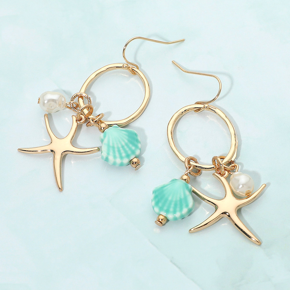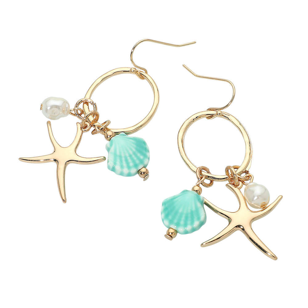 Details • Size : 0.9" X 2.25" • Fish Hook Back • These coastal-inspired drop earrings feature playful starfish accents paired with soft, ocean-themed details for a breezy, expressive look. Perfect for adding a touch of seaside charm to everyday outfits or enhancing a relaxed, resort-style ensemble. • Lead and Nickel Compliant