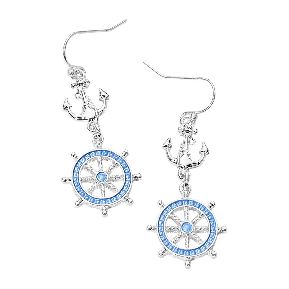 • Statement dangle earrings featuring a nautical anchor and ship wheel design. Perfect for coastal themes, beach shops, and summer collections, these lightweight earrings add playful movement and ocean-inspired charm to everyday outfits, vacation looks, and seasonal accessory displays.