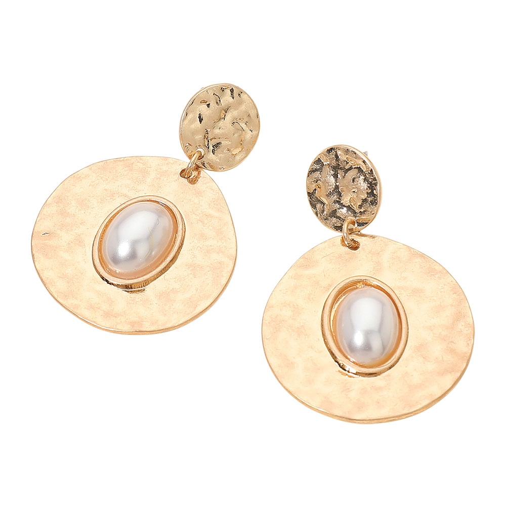 Oval Pearl Center Hammered Disc Drop Dangle Earrings