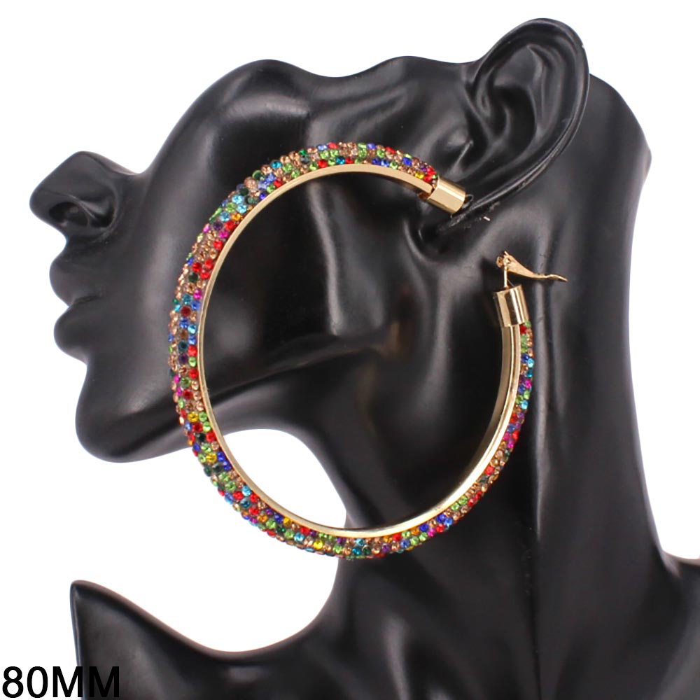 • Statement hoop earrings designed with a sleek curved silhouette and fully embellished surface for maximum shine. The bold 80mm size creates instant impact while remaining lightweight and comfortable for extended wear. Ideal for parties, festivals, night events, and trend-forward jewelry collections.