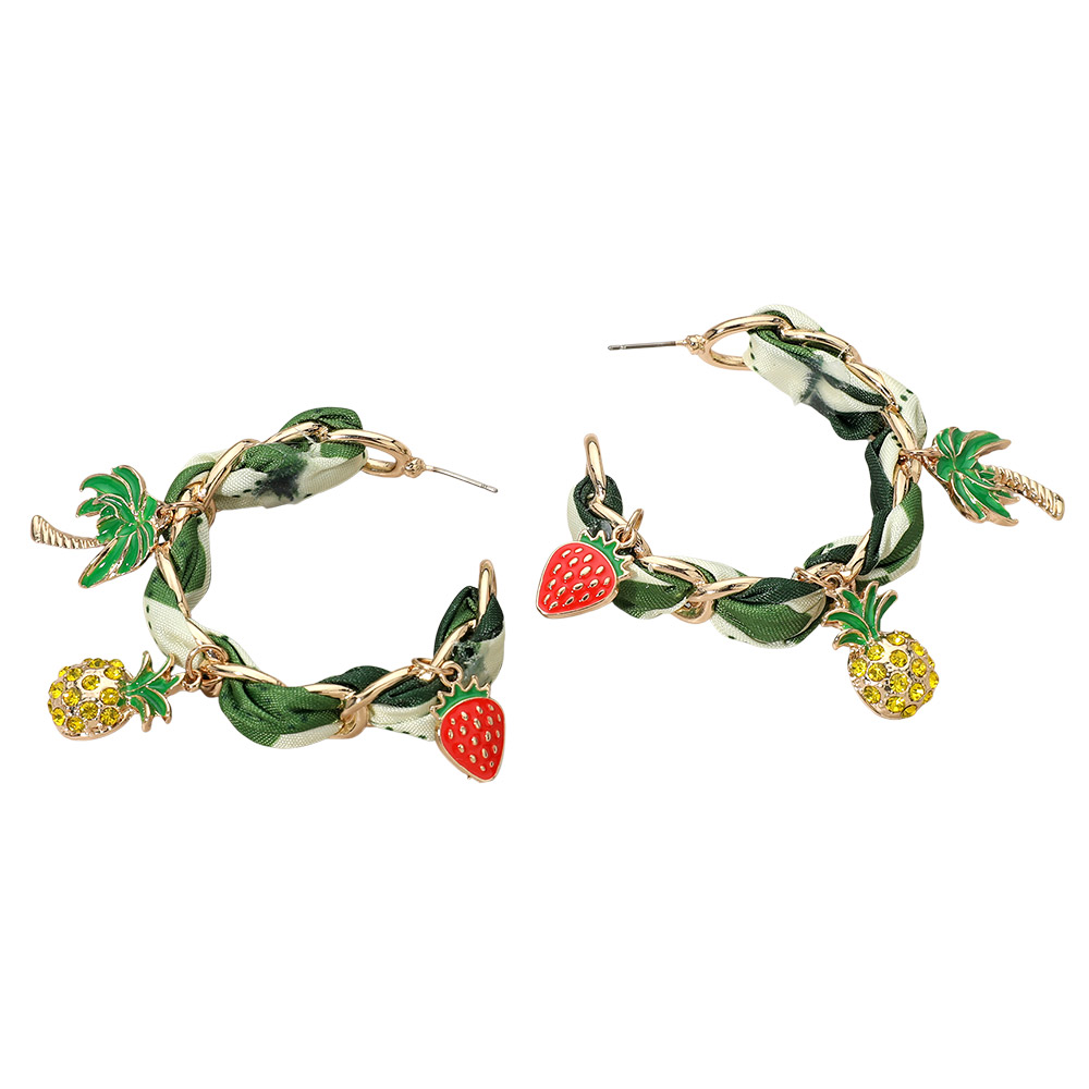 Details • Size : 2" X 2.5" • Post Back • Playful twisted hoop earrings featuring mixed fruit charm accents that add a fun, statement touch to any accessory assortment. Designed to stand out in seasonal displays, these novelty hoops are perfect for boutiques seeking trendy, youthful styles, summer themed collections, vacation looks, and giftable fashion jewelry that draws attention and boosts impulse purchases. • Lead and Nickel Compliant