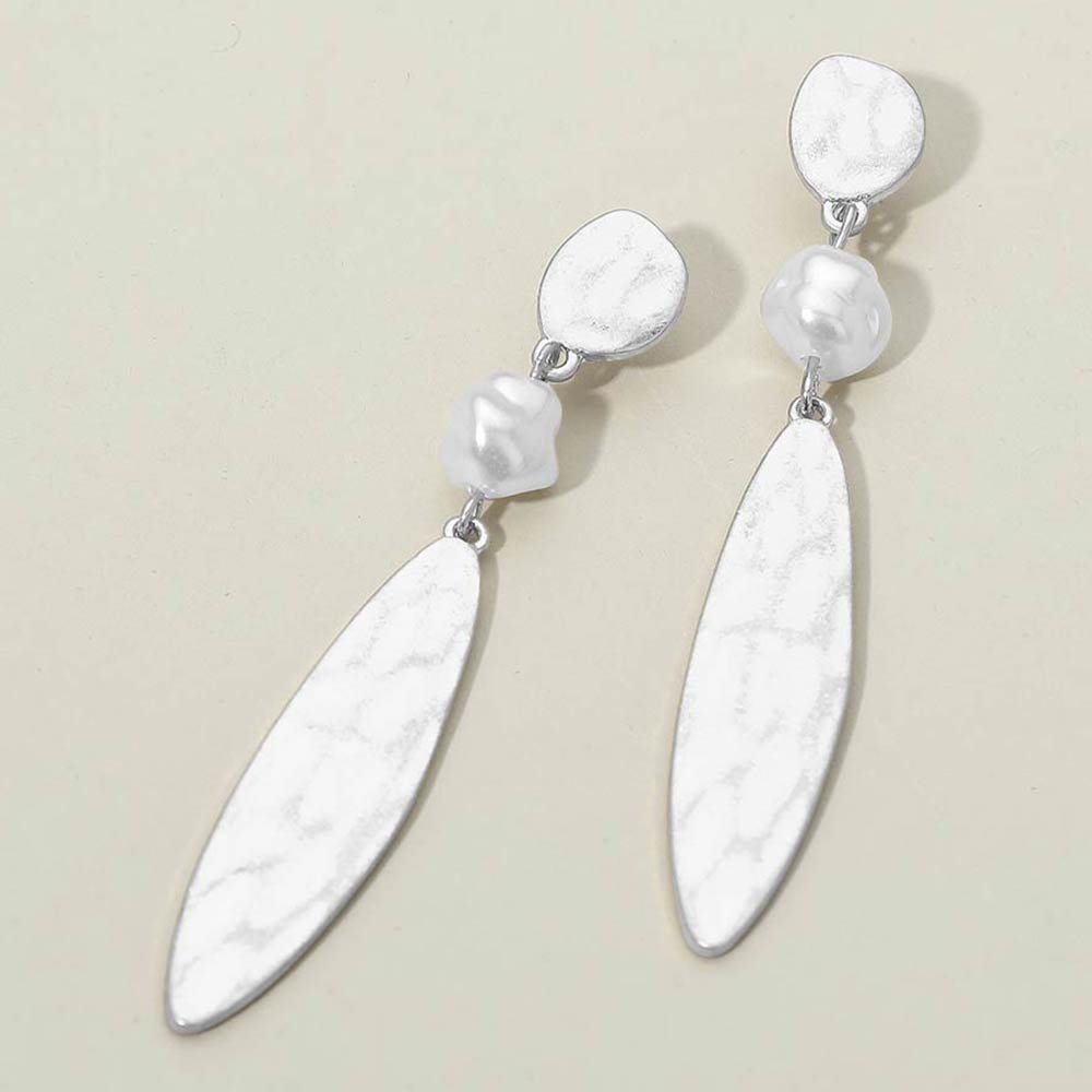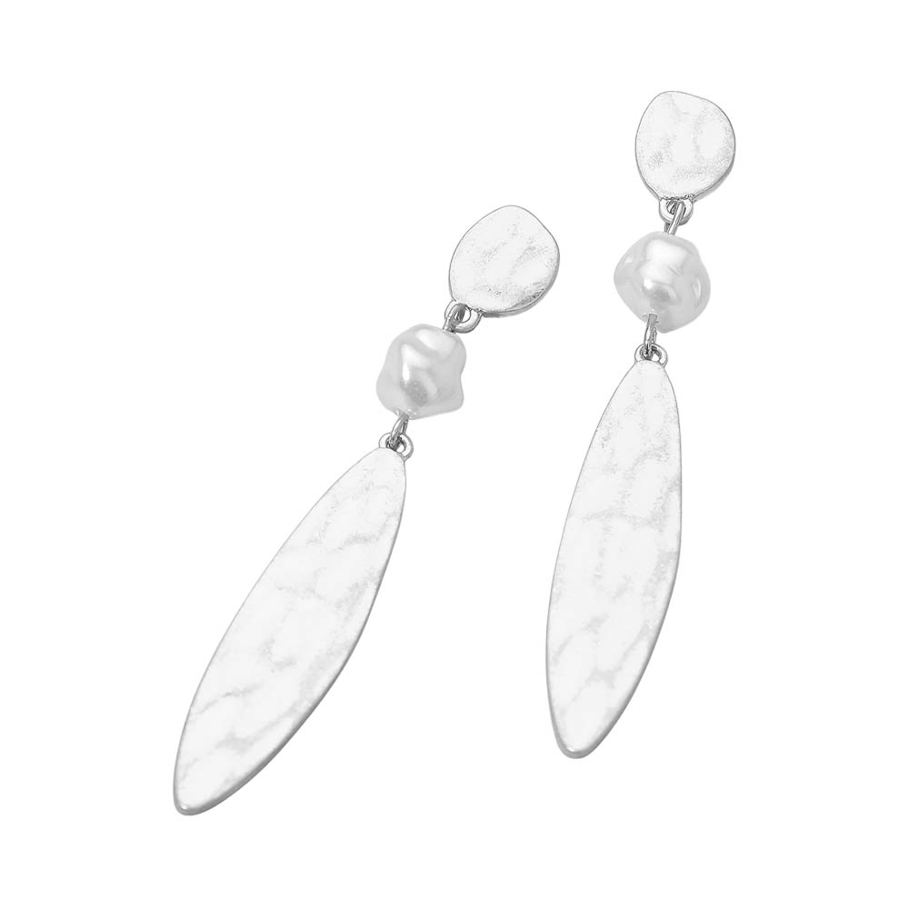 Details • Size : 0.5" X 3" • Post Back • Stylish drop earrings featuring a hammered finish paired with a soft pearl accent for added texture and movement. Designed to elevate everyday outfits and complement dressy looks, these earrings offer a balanced blend of modern shape and timeless charm, making them ideal for work, events, or special occasions. • Lead and Nickel Compliant