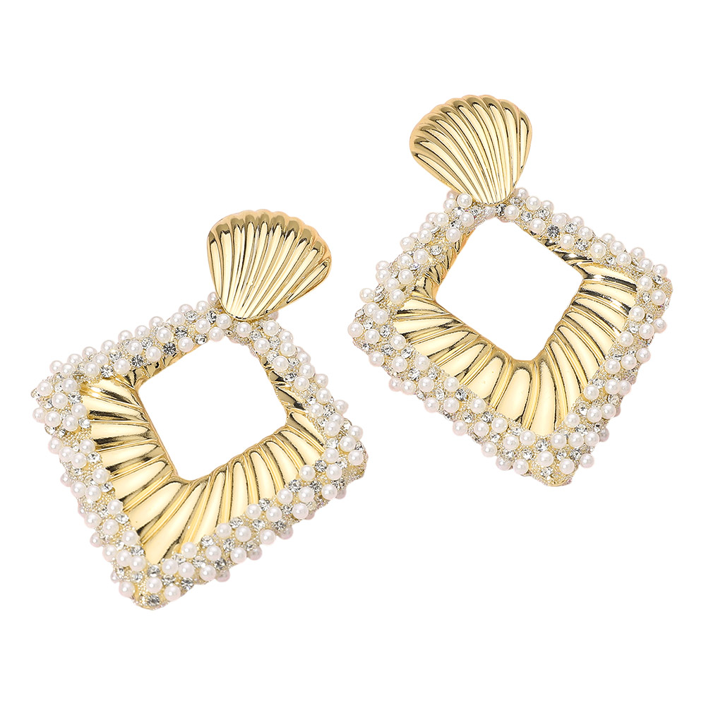 Details • Size : 2.1" X 2.8" • Post Back • These pearl trim square statement earrings feature a sculpted open-frame design with a radiant finish and delicate bead embellishments along the edges. Their bold geometric shape and refined details make them a standout accessory for evening looks or modern, elegant styling. • Lead and Nickel Compliant
