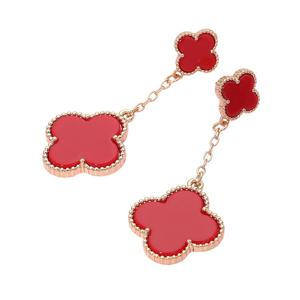 Details • Size : 1" X 2.6" • Post Back • Stylish chain drop earrings featuring layered quatrefoil charms for a soft, elegant look with gentle movement. This timeless silhouette adds refined detail to everyday outfits and special occasion styling, making it a versatile choice for boutiques, gift assortments, and curated jewelry collections seeking modern yet classic appeal. • Lead and Nickel Compliant