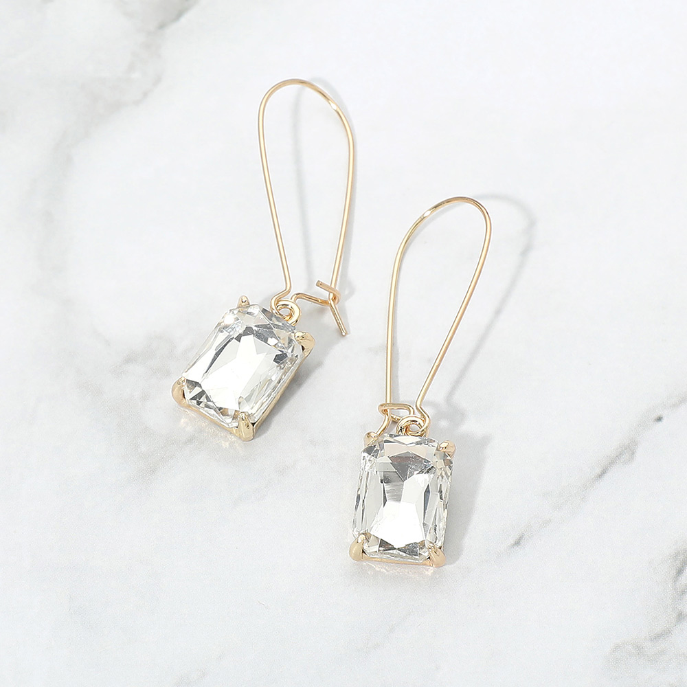 • Elegant drop earrings featuring a faceted rectangular stone suspended from a sleek hook silhouette. Designed to add refined sparkle and movement, this versatile style transitions effortlessly from daytime looks to evening wear, making it a strong addition to boutique jewelry selections, gift assortments, and trend-forward accessory collections.