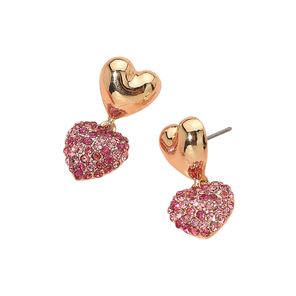 Details • Size : 0.5" X 1.2" • Post Back • Add a touch of romance with these sparkling double heart earrings, featuring a sleek metallic top heart and a dazzling crystal-accented lower heart. Perfect for day-to-night wear, they bring elegant charm and a playful shimmer to your style effortlessly. • Lead and Nickel Compliant