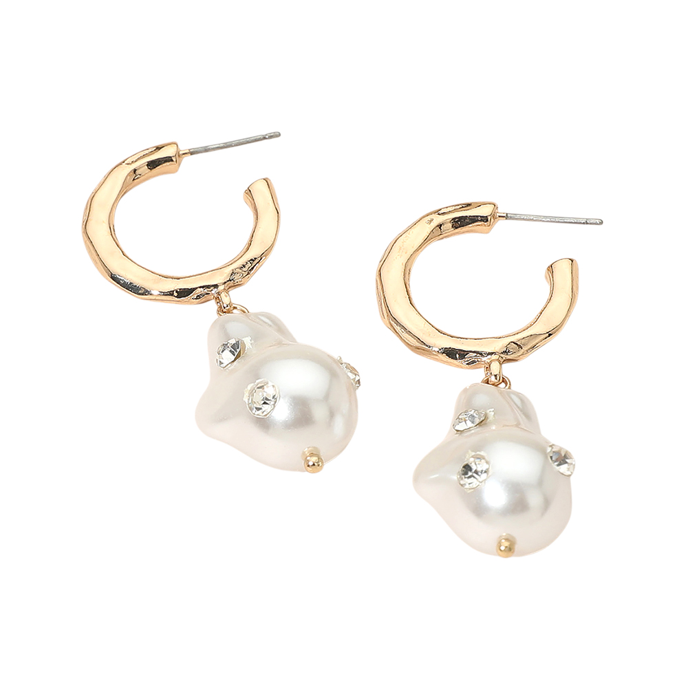 Rhinestone Embellished Organic Pearl Drop Hoop Earrings