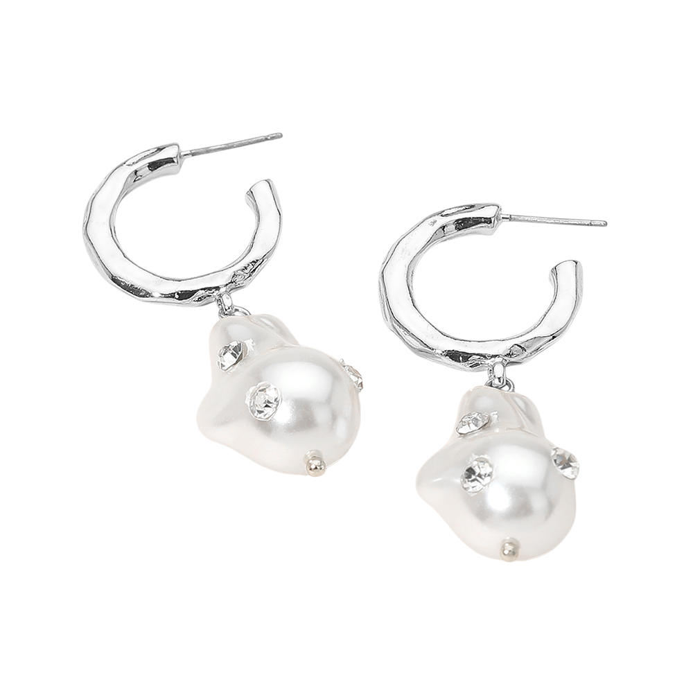 Details • Size : 0.8" X 2" • Post Back • Elegant hoop drop earrings featuring an organically shaped pearl charm accented with subtle crystal details for refined sparkle. This design balances modern structure with soft dimension, making it ideal for everyday wear, gifting, boutiques, and trend-driven accessory collections seeking versatile statement pieces. • Lead and Nickel Compliant