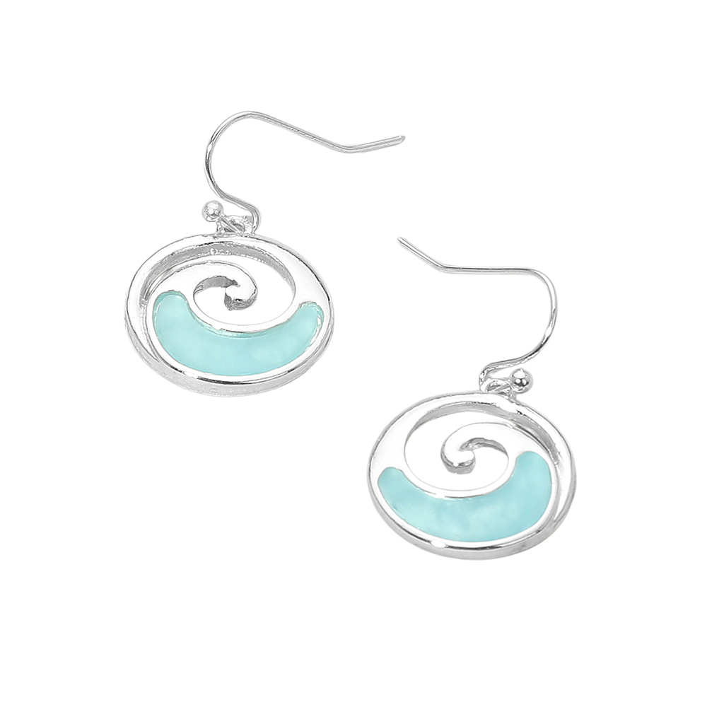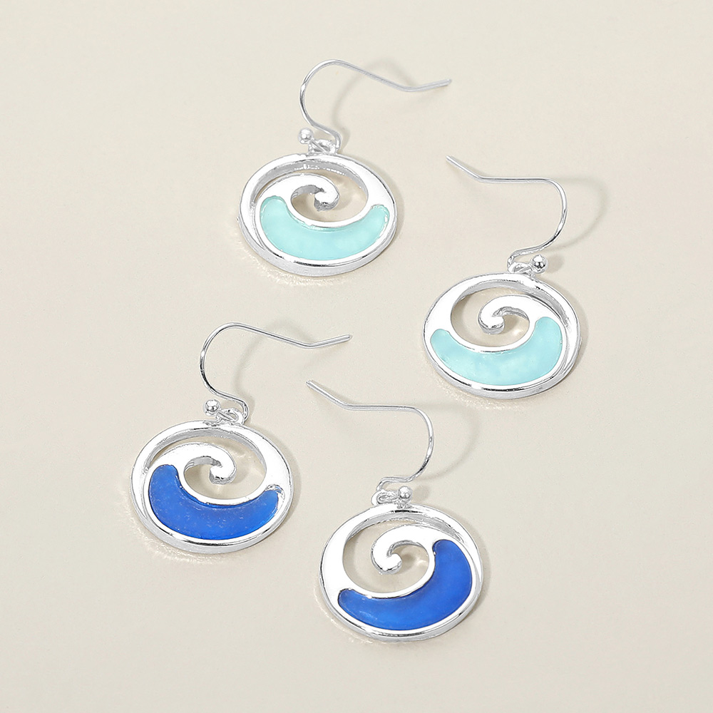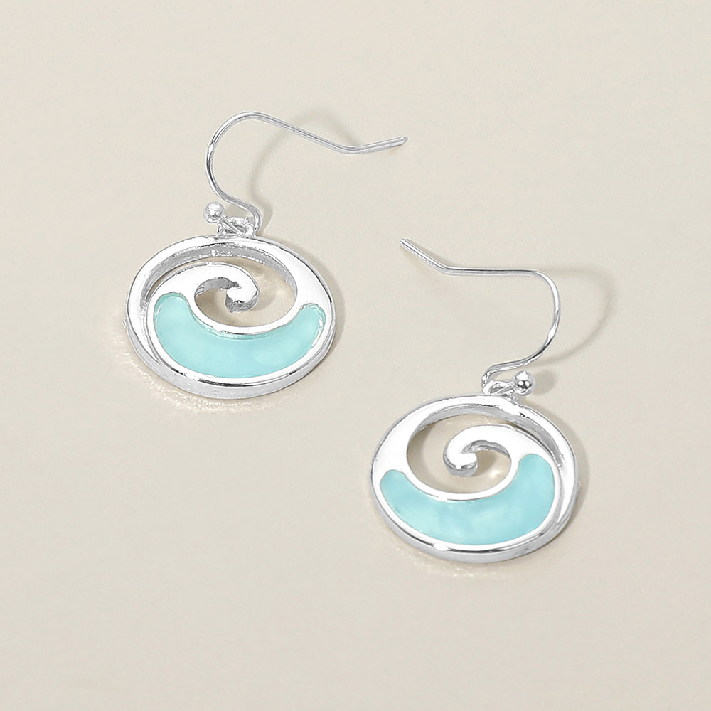 • Stylish ocean-inspired dangle earrings featuring a graceful swirl wave design in a circular silhouette. Lightweight with fluid movement, these earrings bring a coastal, beach-ready feel to everyday outfits, vacation looks, resort wear collections, and giftable accessory assortments for boutiques.