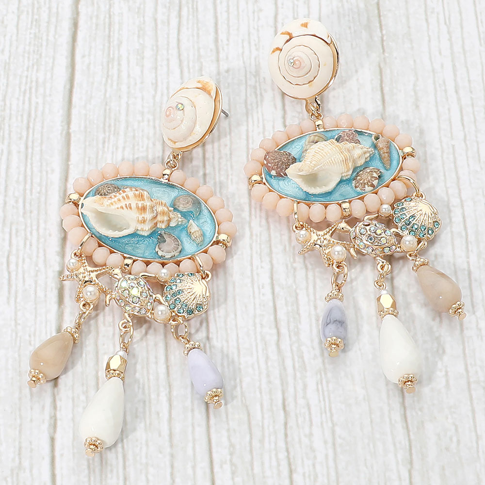 • These seaside shell charm statement drop earrings feature layered coastal-inspired details with textured accents and dangling elements that create eye-catching movement. Designed for boutiques and gift shops, they add bold personality to resort wear, vacation looks, and seasonal collections while delivering strong visual appeal for standout displays.