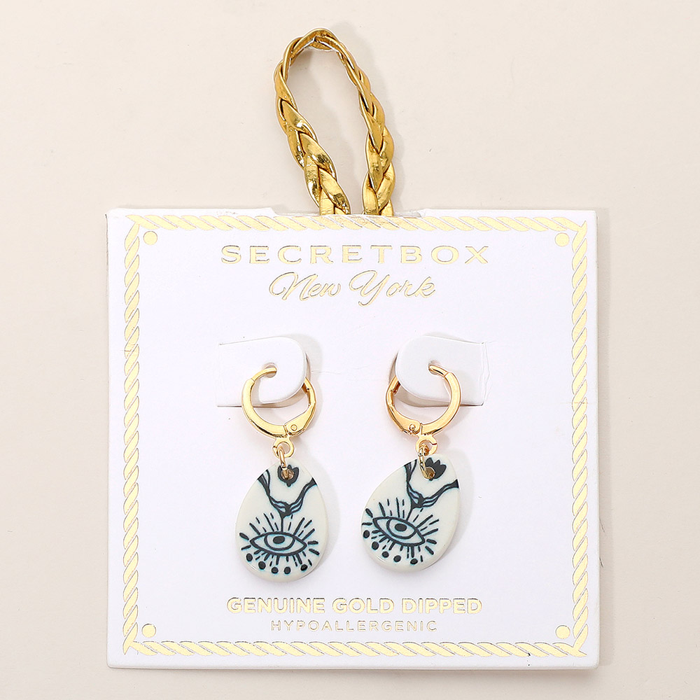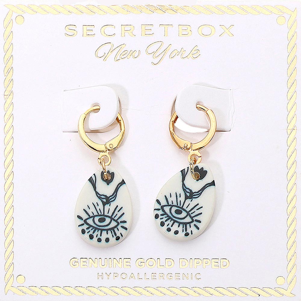 SECRET BOX_Genuine Gold Dipped Evil Eye Symbol Ceramic Teardrop Dangle Huggie Earrings