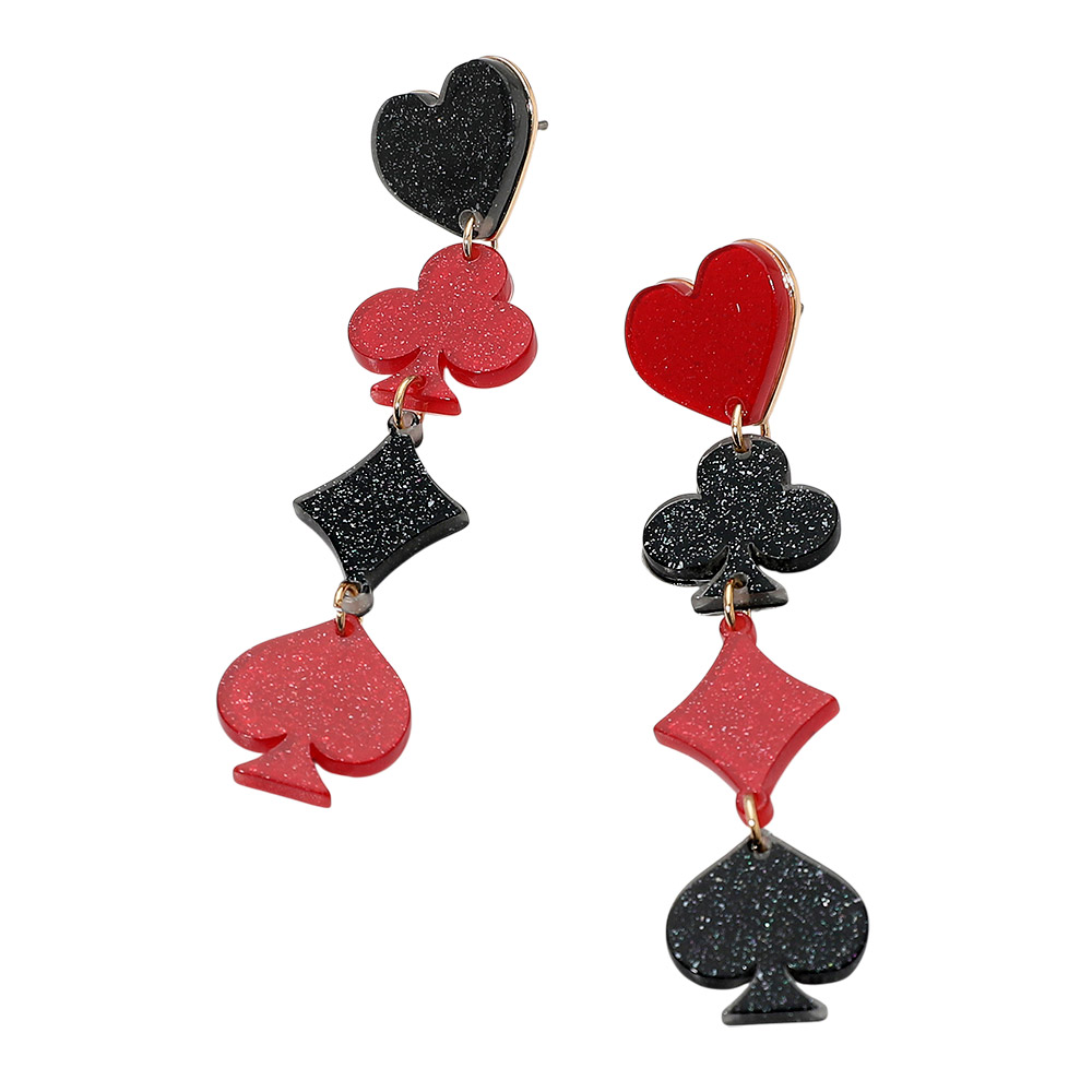 Details • Size : 0.6" X 2.9" • Post Back • Show off bold, playful style with these statement playing card drop earrings. Featuring the four iconic suits and heart tops, they add a unique, whimsical charm to your look. Perfect for parties, themed events, or anyone who loves fashion with a fun and daring twist. • Lead and Nickel Compliant