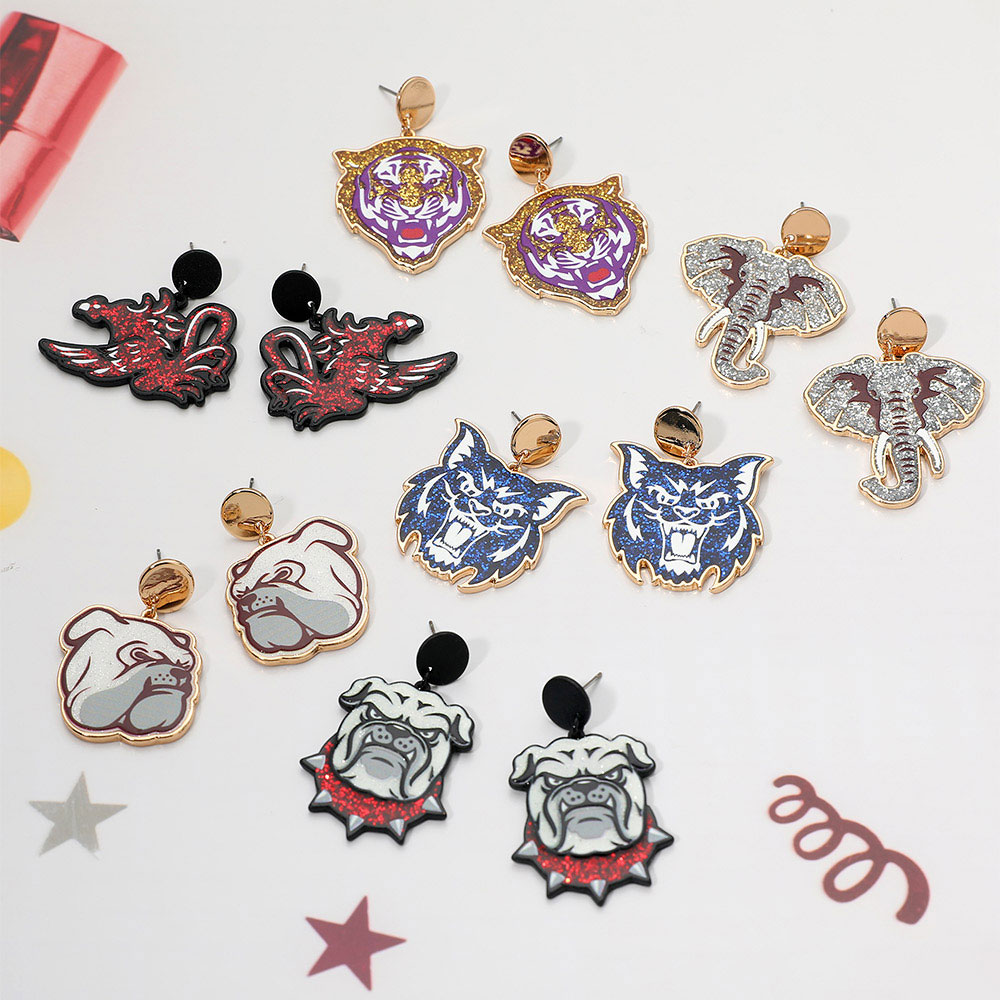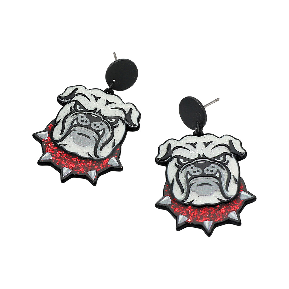 Details • Size : 1.2" X 1.5" • Post Back • Unleash your team pride with these fierce game day bulldog drop earrings. Featuring bold details and a glittering spiked collar, they’re perfect for showing spirit at tailgates, stadiums, or fan events. Make a statement and stand out from the crowd with these spirited, eye-catching earrings. • Lead and Nickel Compliant