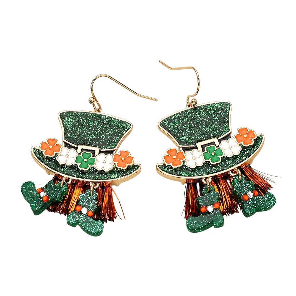 Details • Size : 1.4" X 2" • Fish Hook Back • Playful leprechaun hat dangle earrings designed for St. Patrick’s Day celebrations. Features shamrock accents and festive movement that adds charm to party outfits, parade looks, and holiday displays. A fun seasonal accessory for themed events, gifting, and boutique collections. • Lead and Nickel Compliant