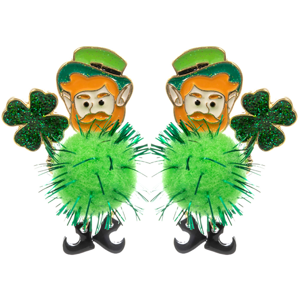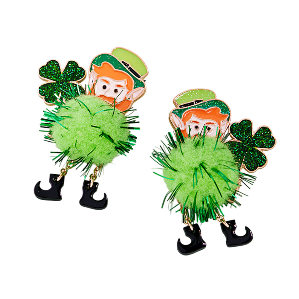 Details • Size : 0.4" X 1.75" • Titanium Post Back • Festive drop earrings featuring playful leprechaun faces, clover accents, and fluffy pom details for standout holiday flair. Lightweight with fun movement, they’re perfect for themed celebrations, party outfits, parades, and novelty gifting, adding a cheerful finishing touch to any Saint Patrick’s look. • Hypoallergenic • Lead and Nickel Compliant