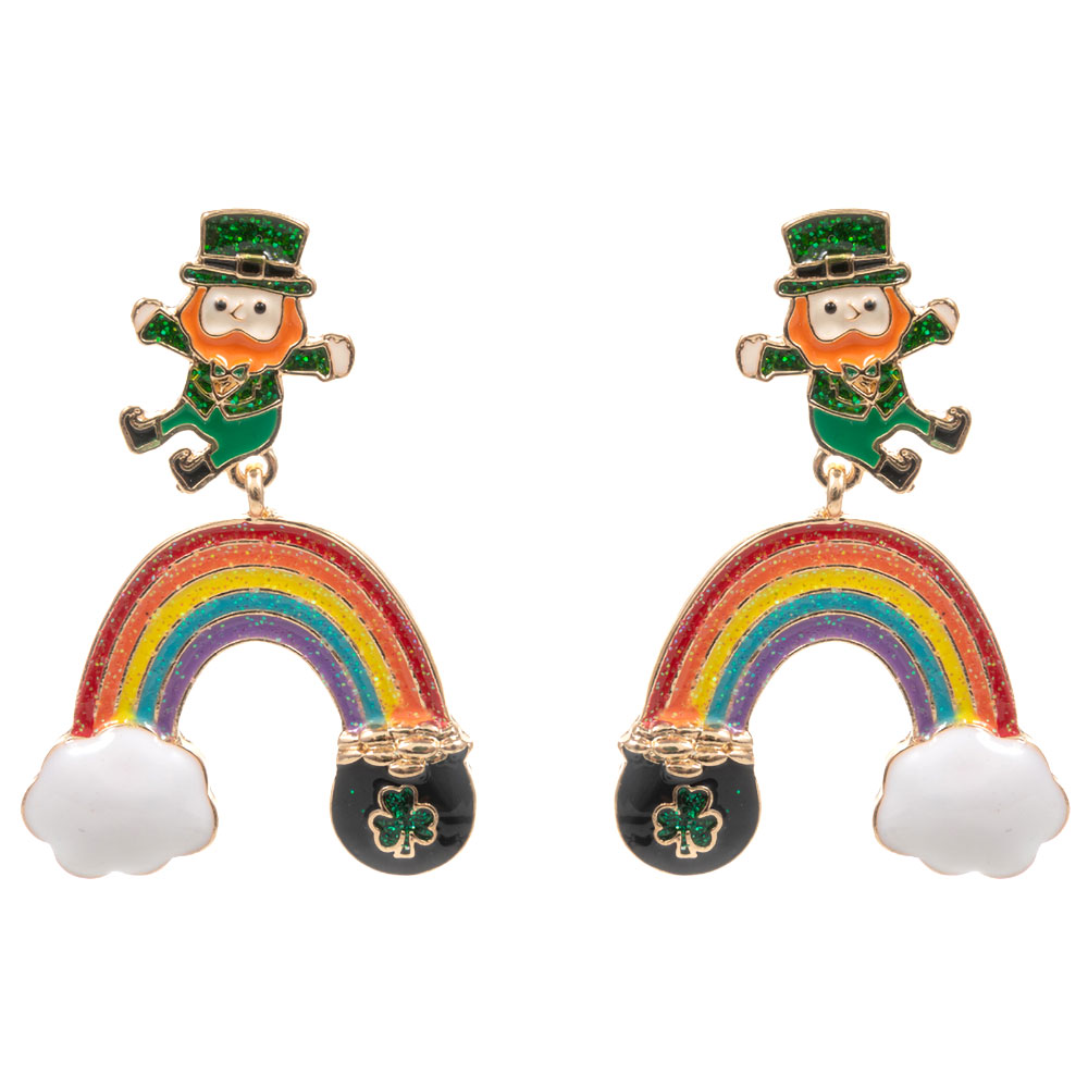 Details • Size : 1.3" X 1.8" • Titanium Post Back • Playful drop earrings featuring a cheerful leprechaun figure paired with a curved rainbow and lucky charm details. Designed to stand out in seasonal and novelty collections, this eye-catching style adds movement, festive character, and fun appeal to themed displays and celebration-ready assortments. • Hypoallergenic • Lead and Nickel Compliant