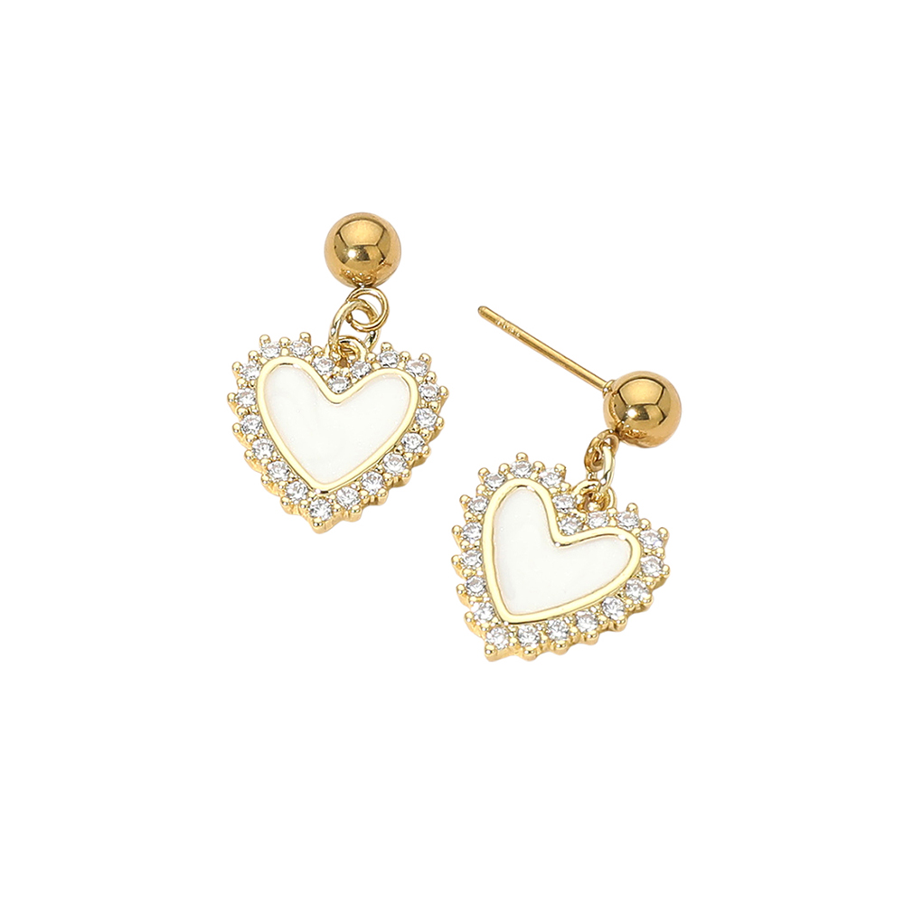Stainless Steel CZ Trim Mother of Pearl Heart Charm Dangle Earrings