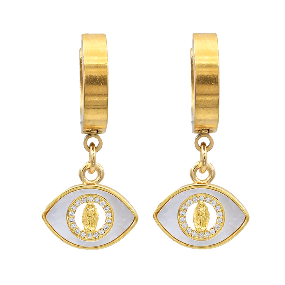 Stainless Steel Mother of Pearl CZ Stone Rim Virgin Mary Accent Evil Eye Charm Dangle Huggie Earrings