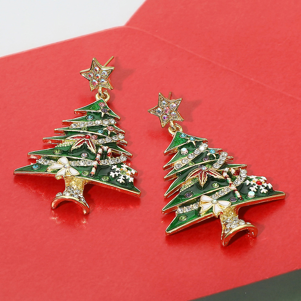 Details • Size : 1.4" X 2.1" • Post Back • Shine bright this holiday season with these sparkling Christmas tree earrings featuring dazzling crystal accents and star toppers. A festive statement accessory perfect for parties, celebrations, or gifting to someone who loves cheerful and elegant holiday style. • Lead and Nickel Compliant