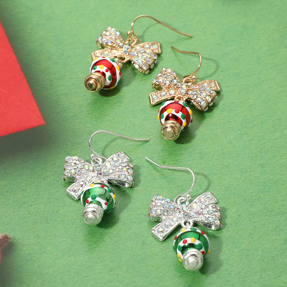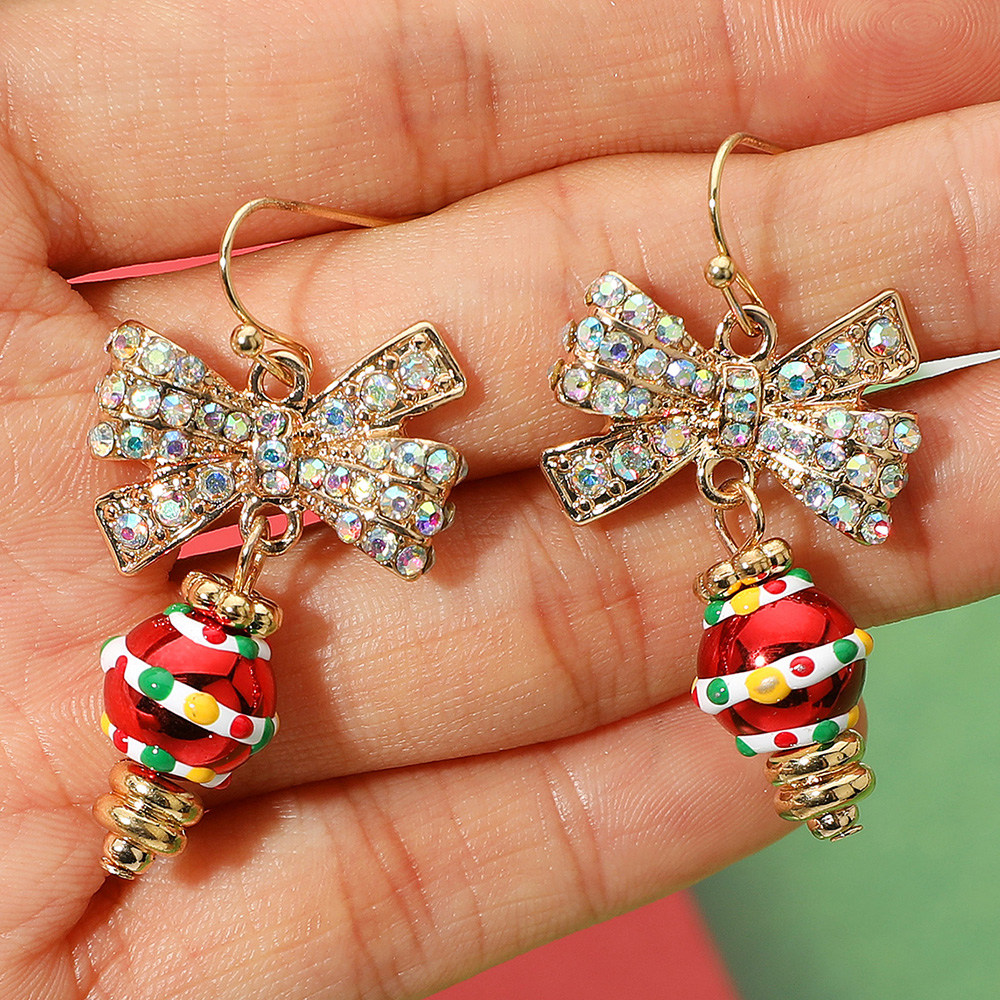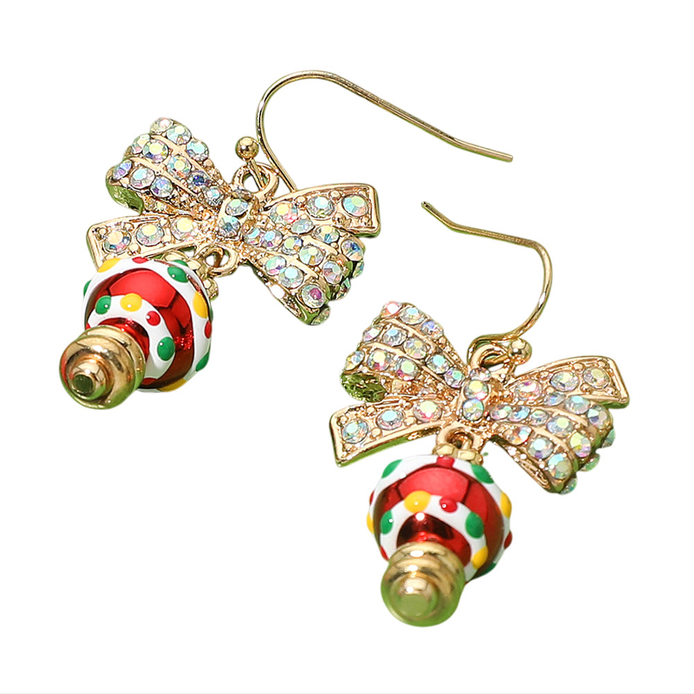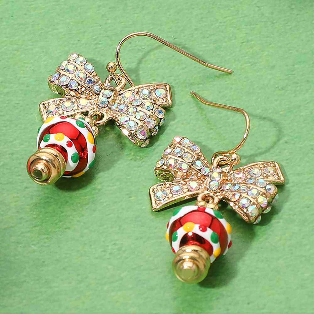 • Festive holiday earrings featuring sparkling bows with dangling ornament charms. Perfect for Christmas parties, seasonal celebrations, or adding a cheerful accent to winter outfits, these earrings combine playful charm with eye-catching sparkle for a joyful accessory.