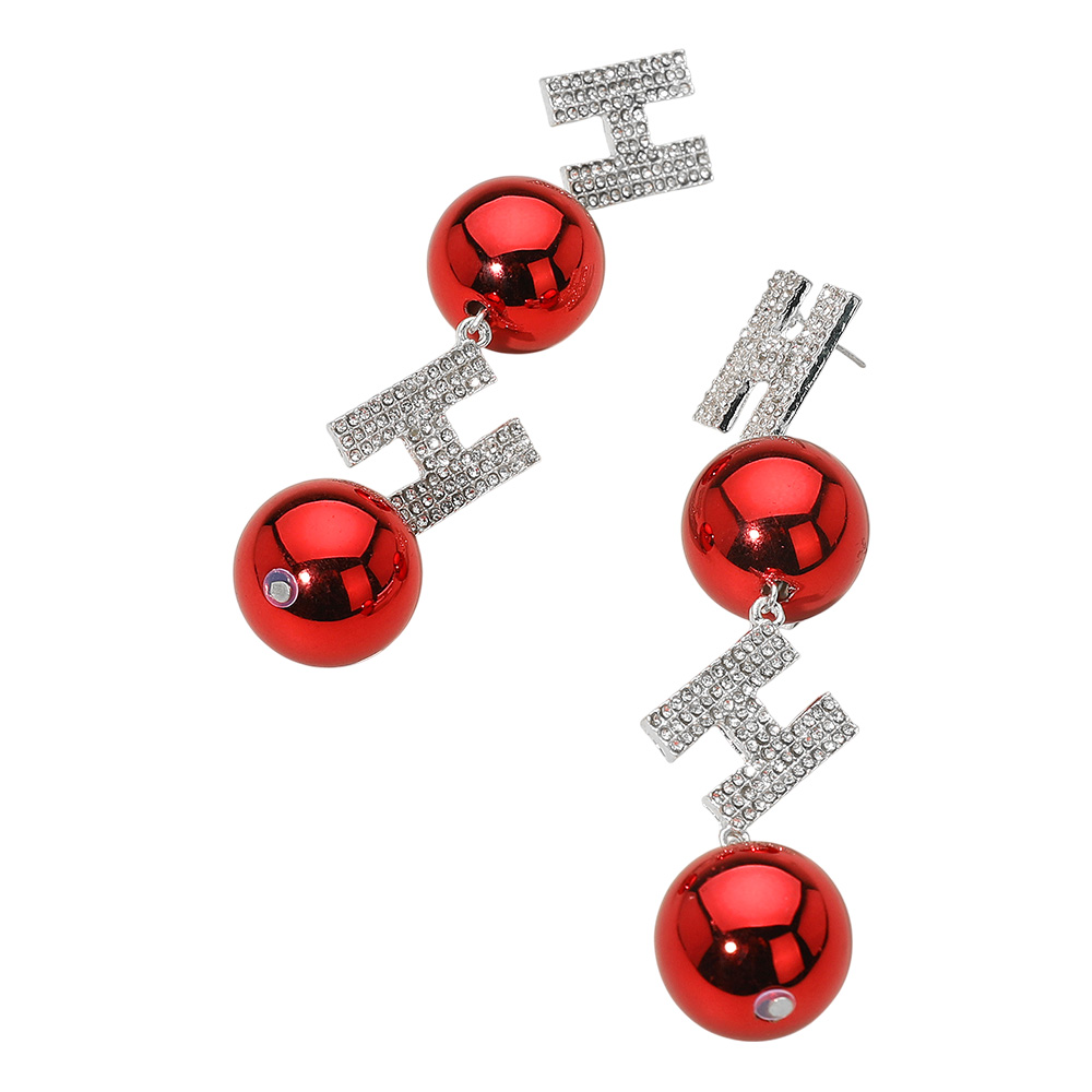 Details • Size : 1" X 3.8" • Post Back • Eye-catching holiday bauble drop earrings accented with sparkling letter details for a bold festive look. Perfect for Christmas parties, celebrations, or adding seasonal flair to your outfit. A fun statement accessory that combines playful charm with glamorous sparkle for the holiday season. • Lead and Nickel Compliant