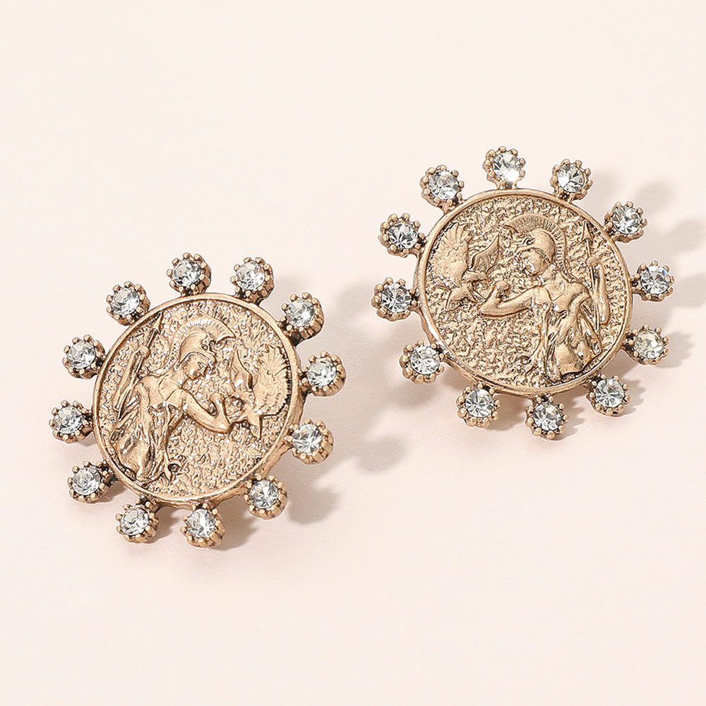Details • Size : 1.3" X 1.3" • Post Back • Bring a touch of vintage glamour to your look with these Embellished Coin Stud Earrings. Designed with a detailed coin centerpiece framed by sparkling accents, these earrings blend classic artistry with modern elegance—perfect for adding sophistication to any outfit. • Lead and Nickel Compliant
