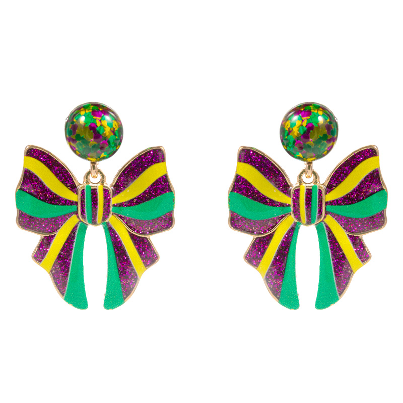Details • Size : 1.1" X 1.5" • Titanium Post Back • Playful bow-shaped drop earrings designed with shimmering striped details and a glossy finish. Lightweight and vibrant, these earrings bring a festive touch to any outfit—perfect for celebrations, themed parties, or adding a statement accent to your everyday style. • Hypoallergenic • Lead and Nickel Compliant