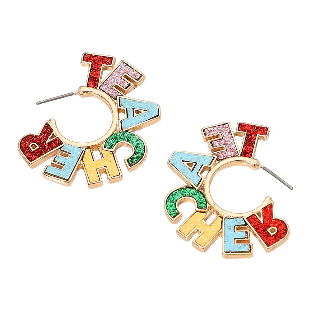 Details • Size : 1.4" X 1.4" • Post Back • Fun letter-accent hoops spelling “TEACHER,” designed to celebrate educators with playful statement style. Perfect for classroom outfits, spirit days, appreciation gifts, and everyday wear to show pride in teaching with personality and charm. • Lead and Nickel Compliant