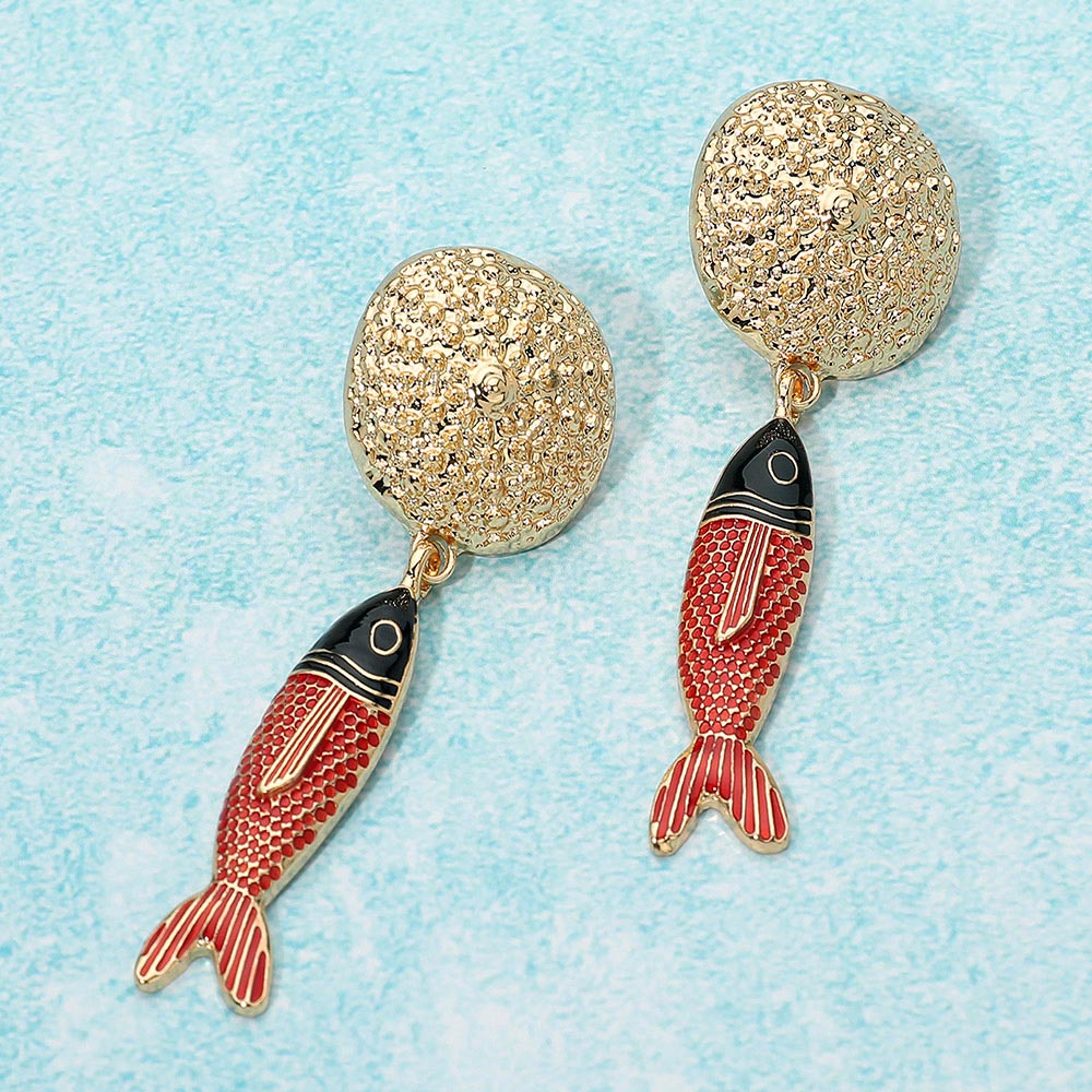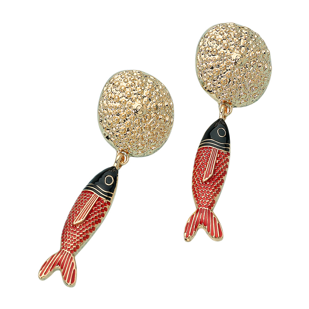 Details • Size : 1" X 3" • Post Back • Make a splash with these fun drop earrings featuring textured discs paired with dangling fish charms. Their whimsical ocean-inspired design blends artistry and charm, making them a standout accessory for beach outings, summer looks, or playful everyday styling. • Lead and Nickel Compliant