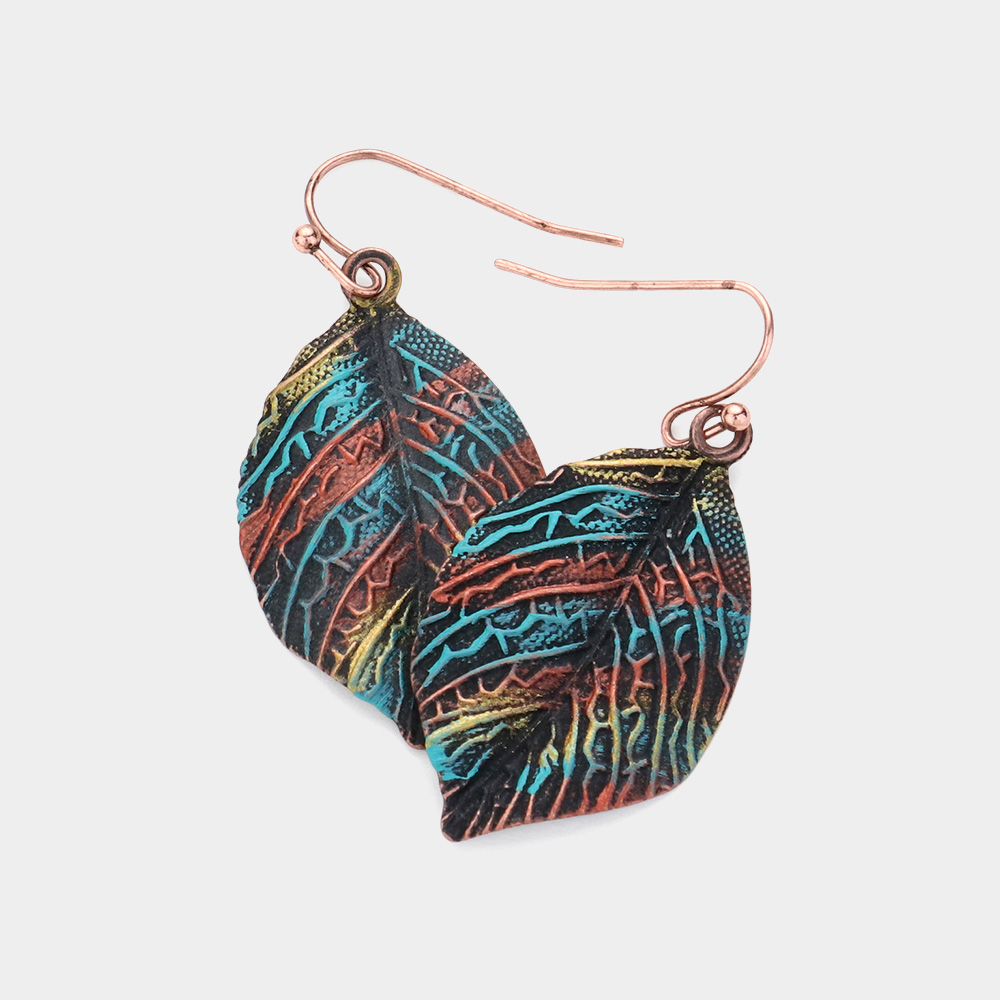 Stitched Faux Leather Layered Metal Leaf Dangle Earrings