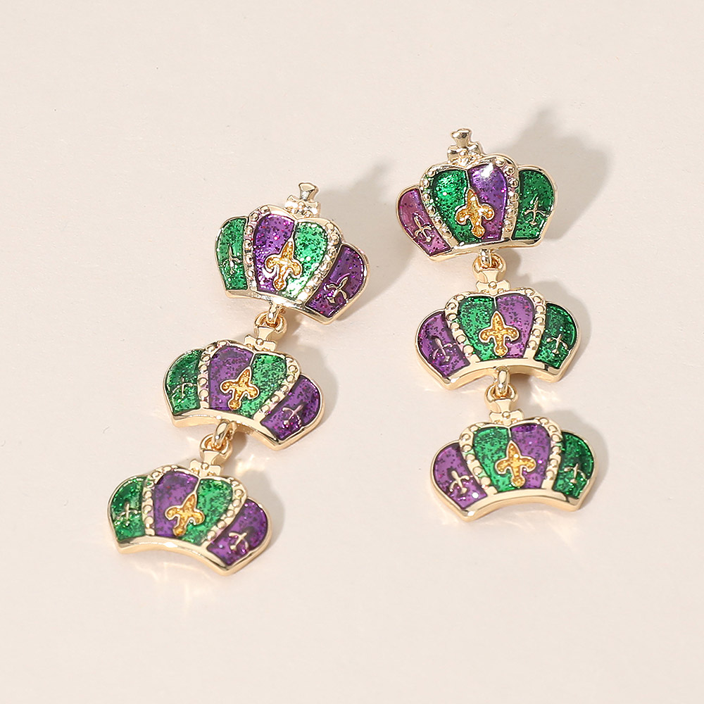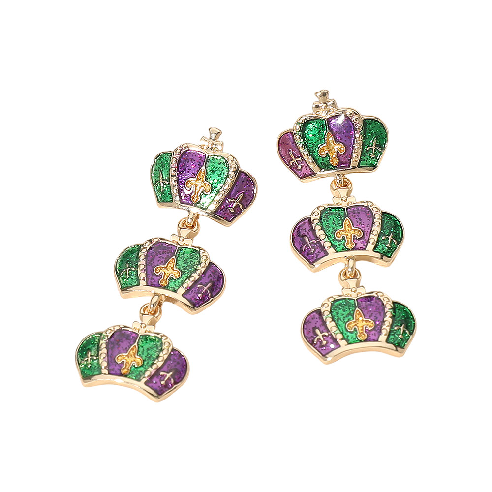 Details • Size : 0.7" X 1.75" • Post Back • These Mardi Gras crown linked drop earrings feature a stacked crown design with playful movement and bold festive charm. Perfect for parade outfits, themed parties, and seasonal displays, they add eye-catching flair to celebration looks and are ideal for boutique assortments, event merchandising, and gift-ready collections. • Lead and Nickel Compliant