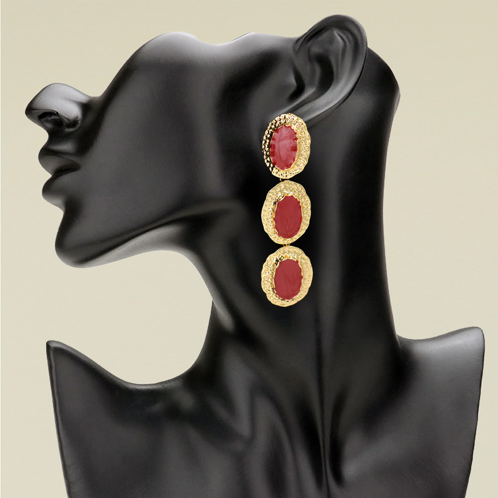 Details • Size : 0.75" X 3.25" • Post Back • Stylish triple oval drop earrings featuring marbled oval centers framed by textured metallic borders. The cascading design adds a touch of modern elegance, perfect for dressing up any outfit. Lightweight yet striking, ideal for parties, special events, or chic everyday wear. • Lead and Nickel Compliant