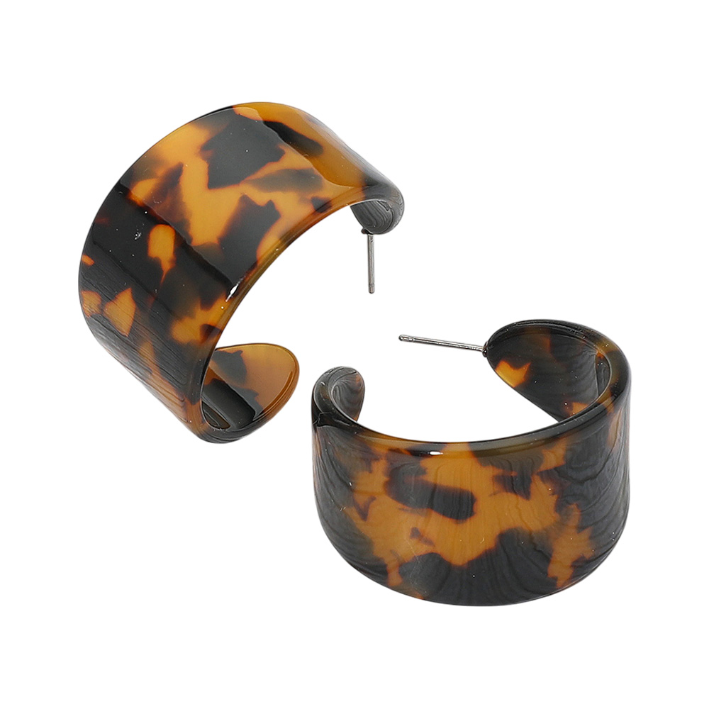 Details • Size : 1.5" X 1.5" X 0.9" • Post Back • Make a statement with these wide tortoise shell hoop earrings. Featuring a bold curved silhouette and glossy marbled finish, they add instant sophistication and vintage-inspired charm to any outfit—perfect for elevating casual looks or completing evening ensembles. • Lead and Nickel Compliant