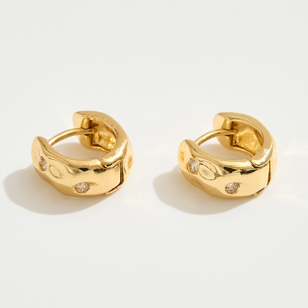 14K Gold Dipped CZ Stone Paved Hammered Mini Huggie Hoop Earrings