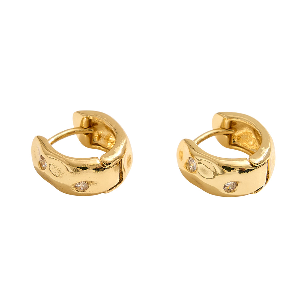 Details • Size : 0.4" X 0.5" X 0.25" • Huggie Back • These mini huggie hoop earrings feature a bold textured design accented with sparkling CZ stones for a modern yet timeless look. Compact and versatile, they are perfect for stacking or wearing solo, adding just the right amount of shine to any outfit. • Brass • CZ Cubic Zirconia • Gold Dipped • Hypoallergenic • Lead and Nickel Compliant • Made In Korea